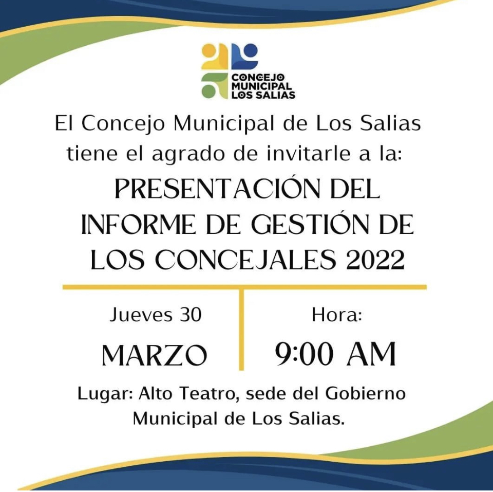 El Concejo Municipal de Los Salias tiene el agrado de invitar a todos los sanantoñeros a la Presentación del Informe de Gestión 2022 de los concejales del ente Legislativo.